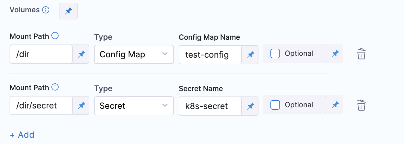 - Under Volumes, click Add.