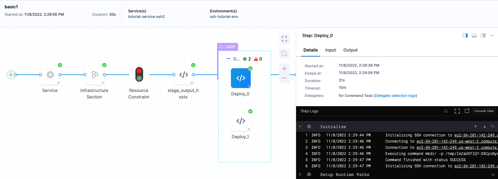 Here is an SSH deployment example with a Command step that uses <+stage.output.hosts>:
