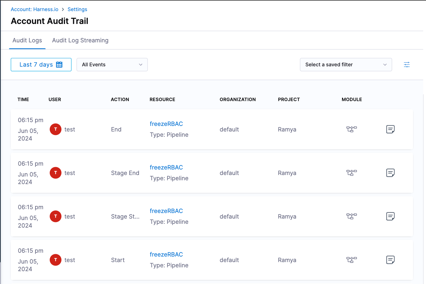The Audit Trail page opens, displaying a record for each event that changed the setup of your Harness account, modules, or Harness entities. By default, Harness shows audit logs for the previous 7 days.