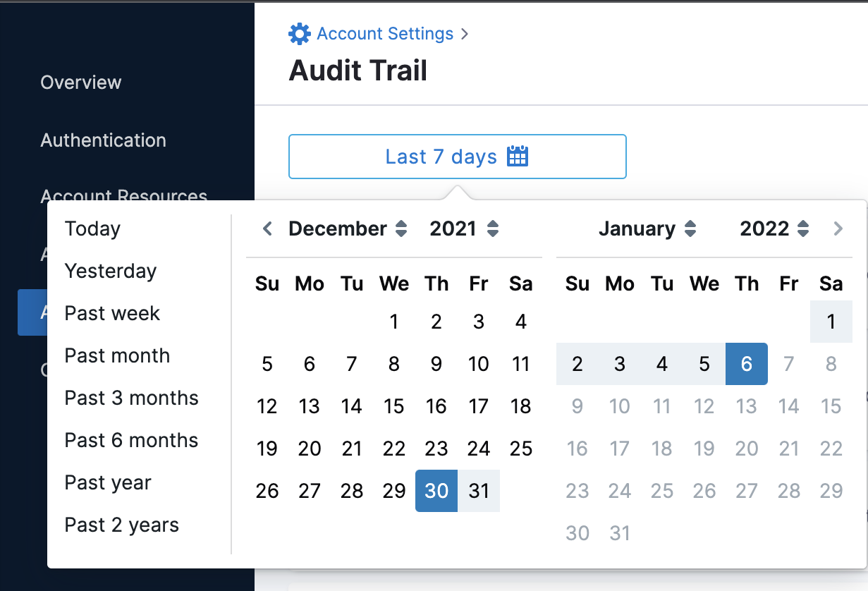You can view audit trail data at the Account or Org scope. This topic explains how to view audit trail data at the account scope.