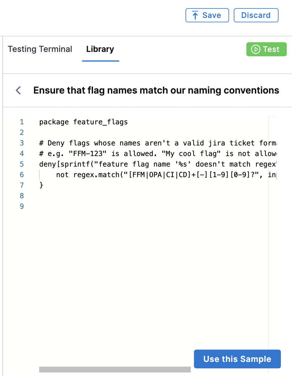 Select a pre-existing flag policy from the list. The Rego code will populate in the Library editor.