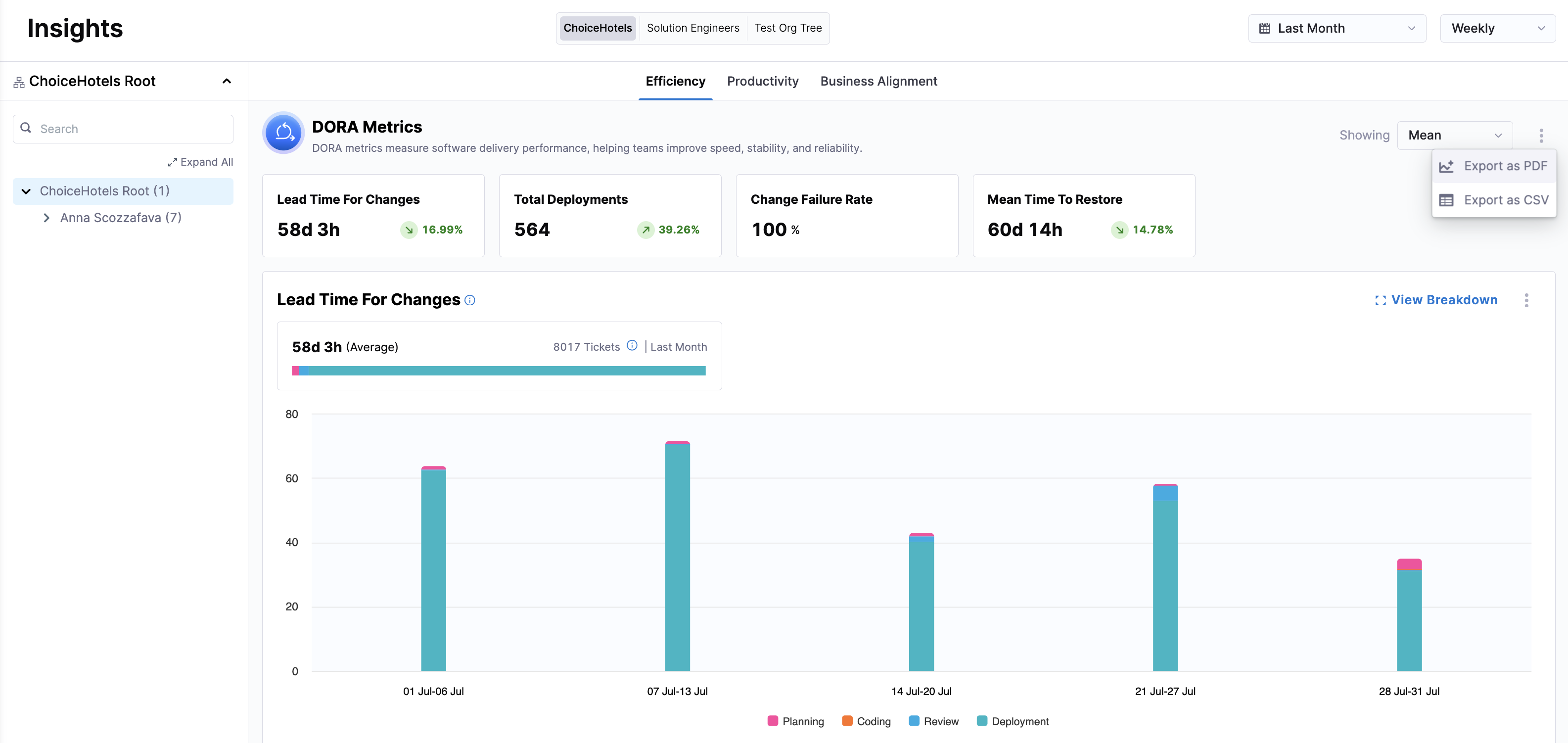 Export data for entire insight categories, such as Efficiency, Productivity, and Business Alignment. This includes all widget metrics like Lead Time for Changes, Deployment Frequency, Change Failure Rate, and Mean Time to Restore.