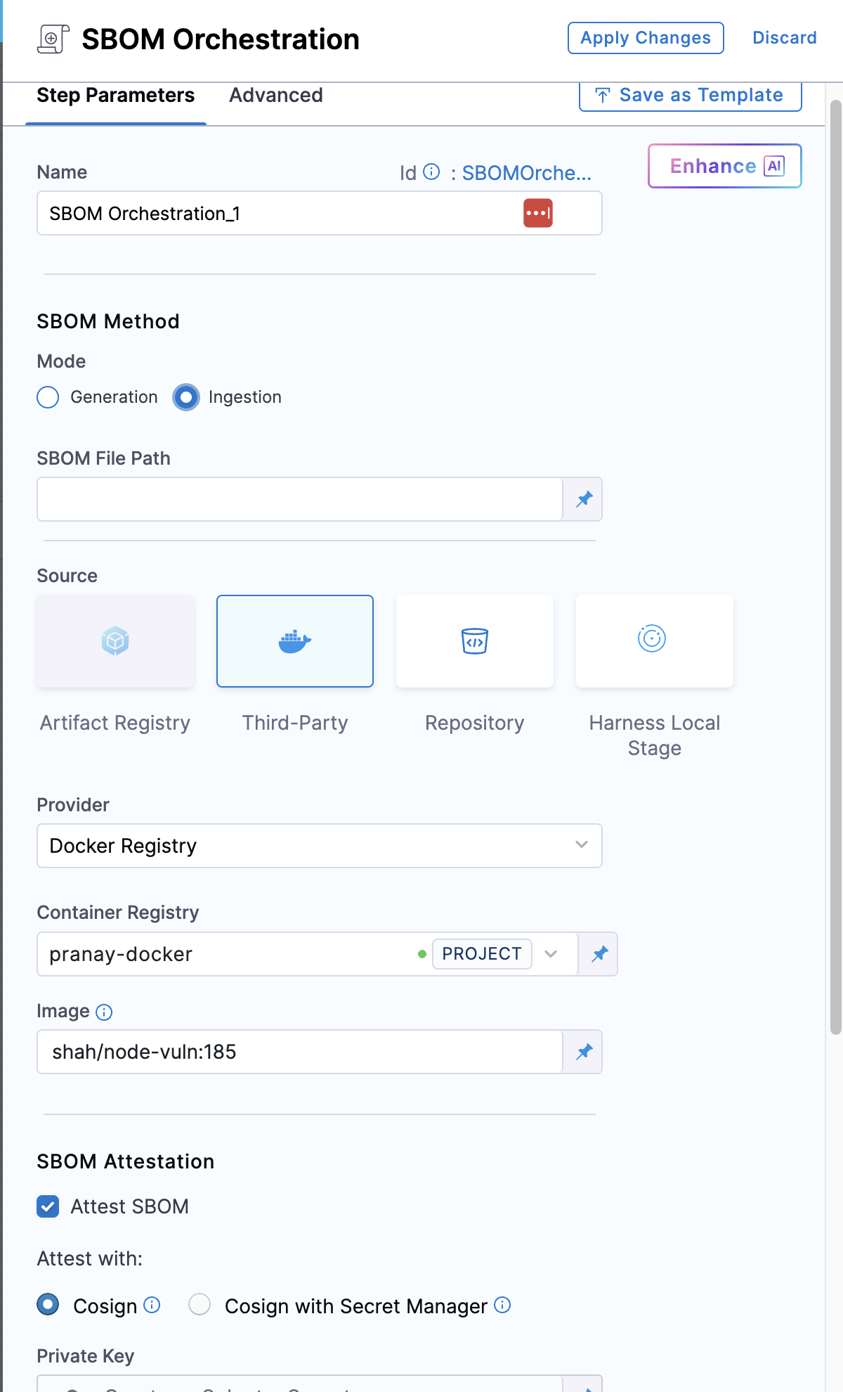 Configure the SBOM Orchestration step in SCS to seamlessly ingest SBOM. In this example, we will generate an SBOM using the Trivy CLI in a CI Run step, and then ingest it using the SBOM Orchestration step.